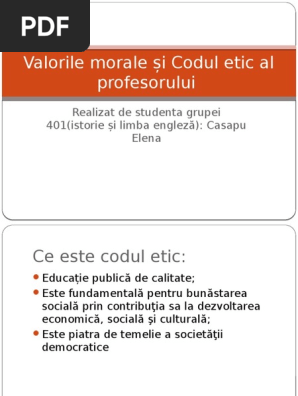 Codul etic al profesorului ce vizează codul de etică profesoral o educaţie publică de calitate, piatră de temelie a societăţii a. Ministerul educatiei a relansat codul etic al profesorului pentru invatamantul preuniversitar, care aduce o serie de noi obligatii, dar si sanctiuni pentru cei care nu il respecta. Prevederile din acest cod interzic, printre altele, „meditatiile contra cost cu beneficiarii directi ai educatiei de la formatiunile de.