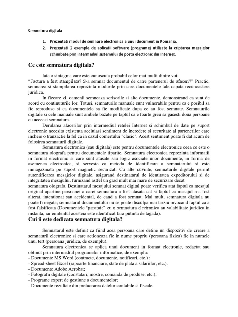 Semnătura electronică este un instrument necesar pentru a comunica mai ușor cu instituțiile statului, în interiorul unei firme sau în raport cu alte firme ori persoane fizice. 455/2001 privind semnatura electronica, o semnatura electronica extinsa este acea semnatura care intruneste cumulativ urmatoarele conditii semnatura electronica simpla este creata pe baza unui certificat digital simplu. Semnătura electronică înseamnă date în format electronic, atașate la sau asociate logic cu alte date în format electronic și care sunt utilizate de semnatar pentru a semna.