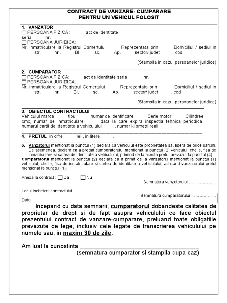 vizitati articolul complet aici : https://greenwaywet929.weebly.com/blog/category/all Contract de vanzare cumparare autovehicul folosit ( model contract actualizat la iulie 2010 ) necesar la inmatriculare auto. Actele de vanzare cumparare auto ( contractul ) nu are o baza legala decat in momentul in care vanzatorul a scos masina de pe numele lui. Inmatricularea auto in 2019 trebuie facuta in cel mult 30 de zile de la momentul dobandirii in cazul contractului de vanzare auto care are ca obiect un autoturism, legea prevede faptul ca este necesara forma scrisa.