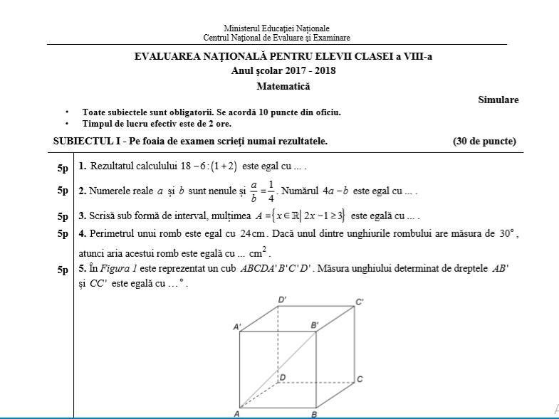 0a matematica clasa a ii a. Subiect si baremul simulare romana 2019 (clasa a 8 a). Simulare evaluare națională clasa a 8 a.