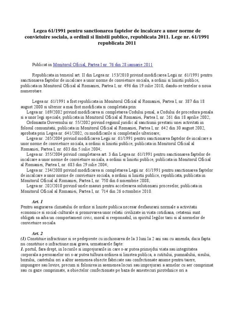 61/1991*) (r4) pentru sanctionarea faptelor de incalcare a unor norme de convietuire sociala, a ordinii si linistii publice. 61 din 27 septembrie 1991 (*republicată*)pentru sancționarea faptelor de încălcare a unor norme de conviețuire socială, a ordinii . Legea 61/1991 pentru sancționarea faptelor de încălcare a unor norme de convieţuire socială, a ordinii și liniștii publice incriminează:. 61 din 27 septembrie 1991pentru sancţionarea faptelor de încălcare a unor norme de convieţuire socială, a ordinii şi liniştii publice . 11 din legea nr.61/1991 pentru sancţionarea faptelor de încălcare a unor norme de convieţuire socială, a ordinii şi liniştii publice, republicată.